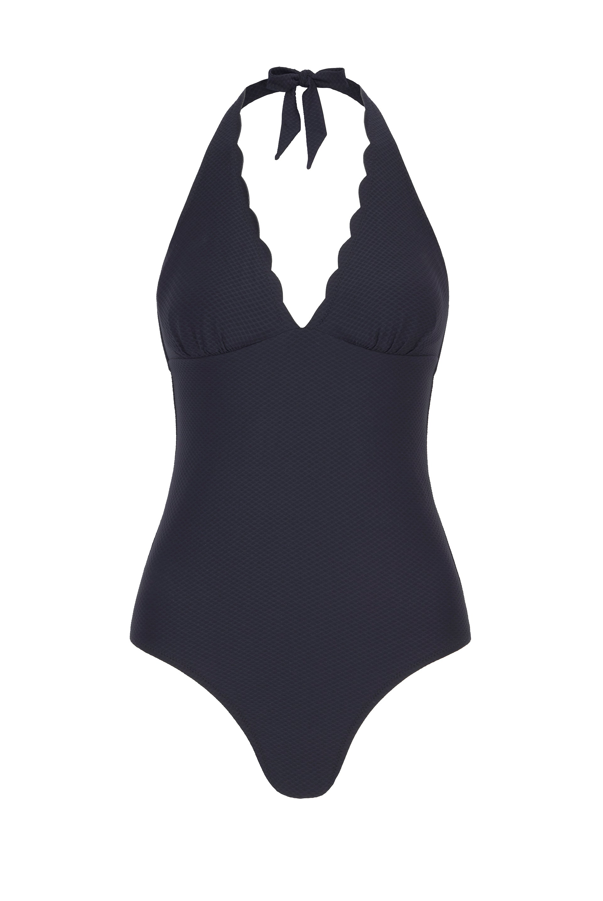 The Perissa scallop halterneck, one of our most flattering designs, features a plunging scalloped front, underwired support, and sustainable honeycomb fabric.