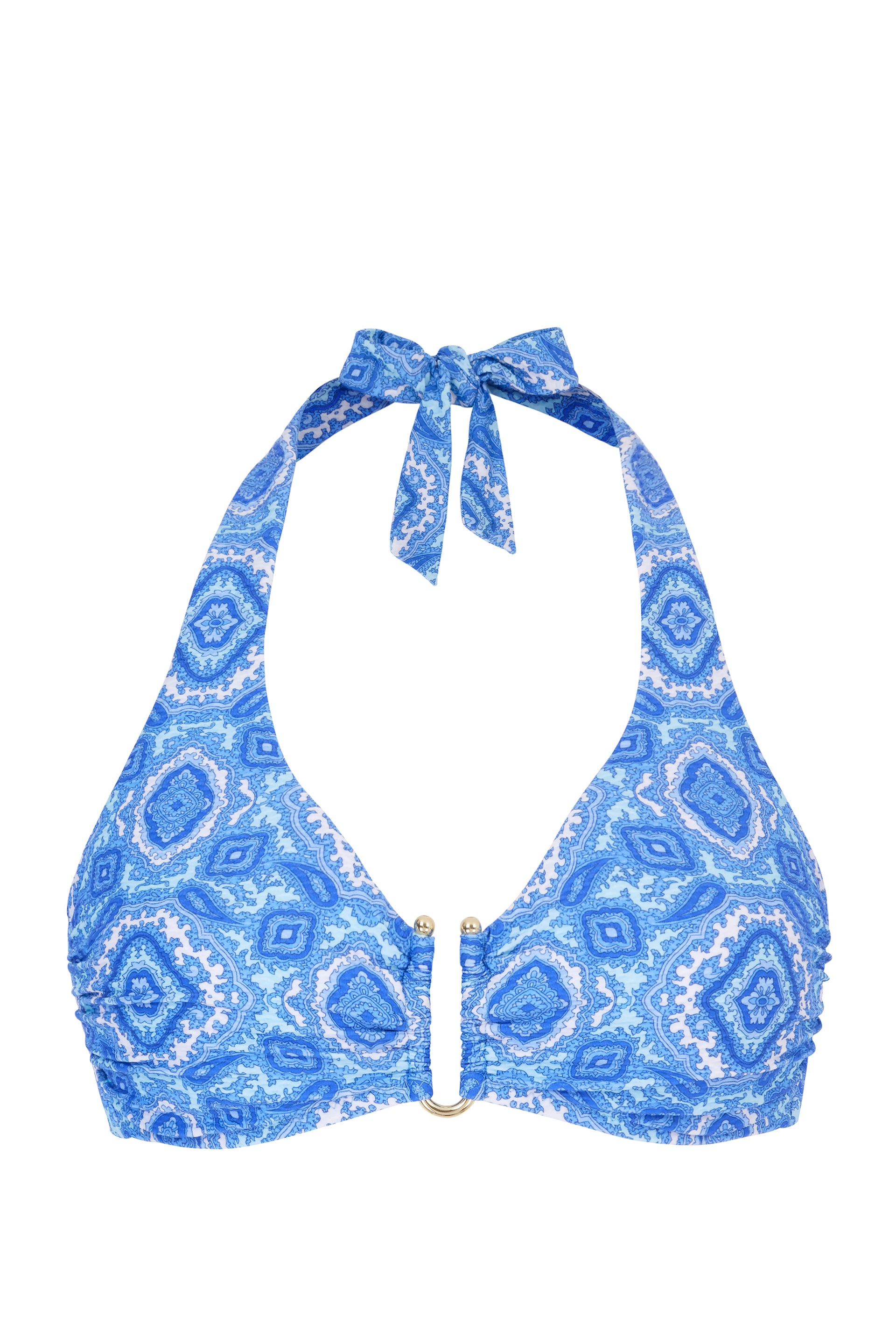 The Mykonos U-Bar top in paisley tile print features underwired cups for high bust support, finished with heat-resistant gold hardware for a flattering fit.