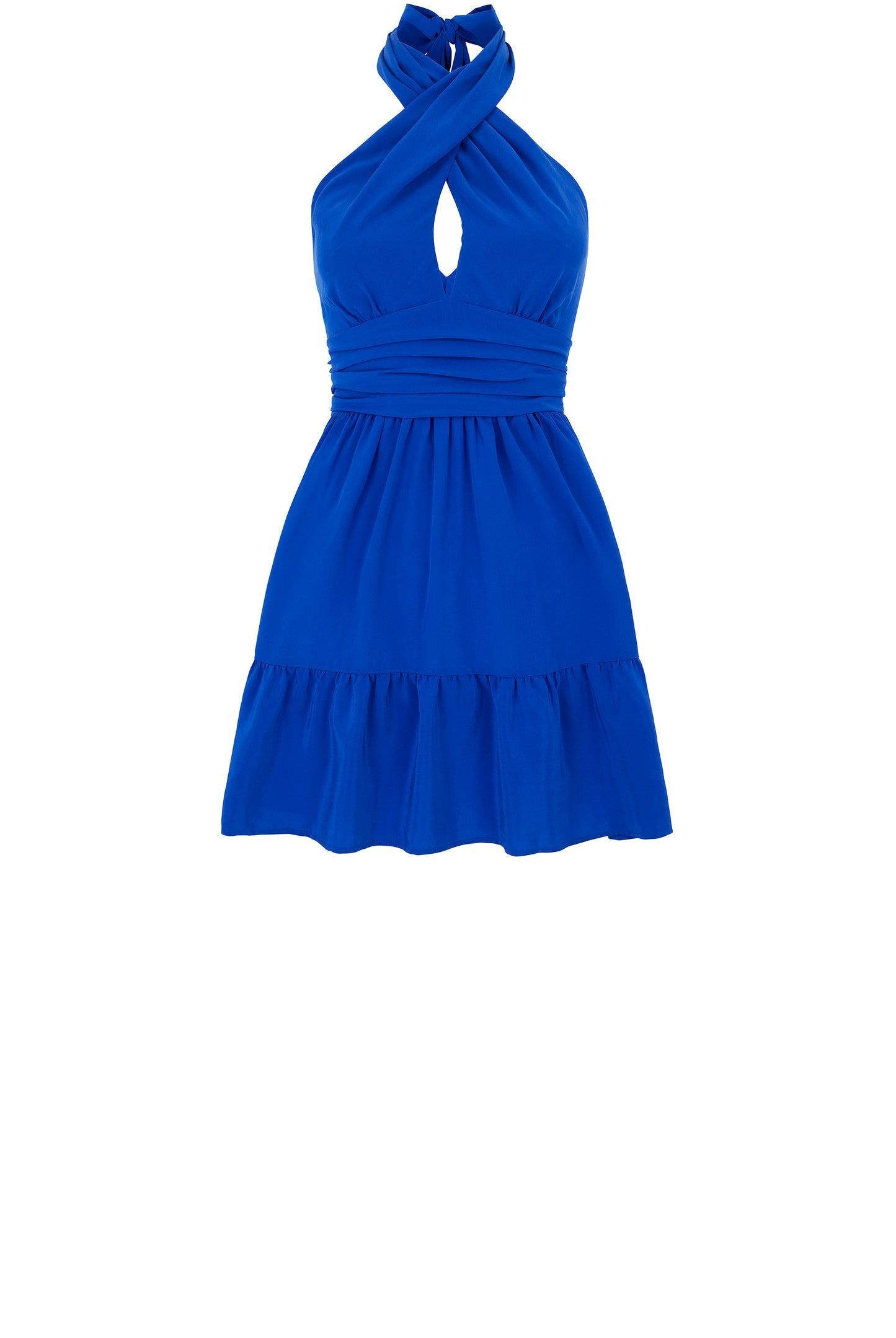 Our Beau Soleil cross neck mini dress, in a bright Mediterranean blue, has a pretty smocked back and tie behind the neck - perfect for summer evenings.