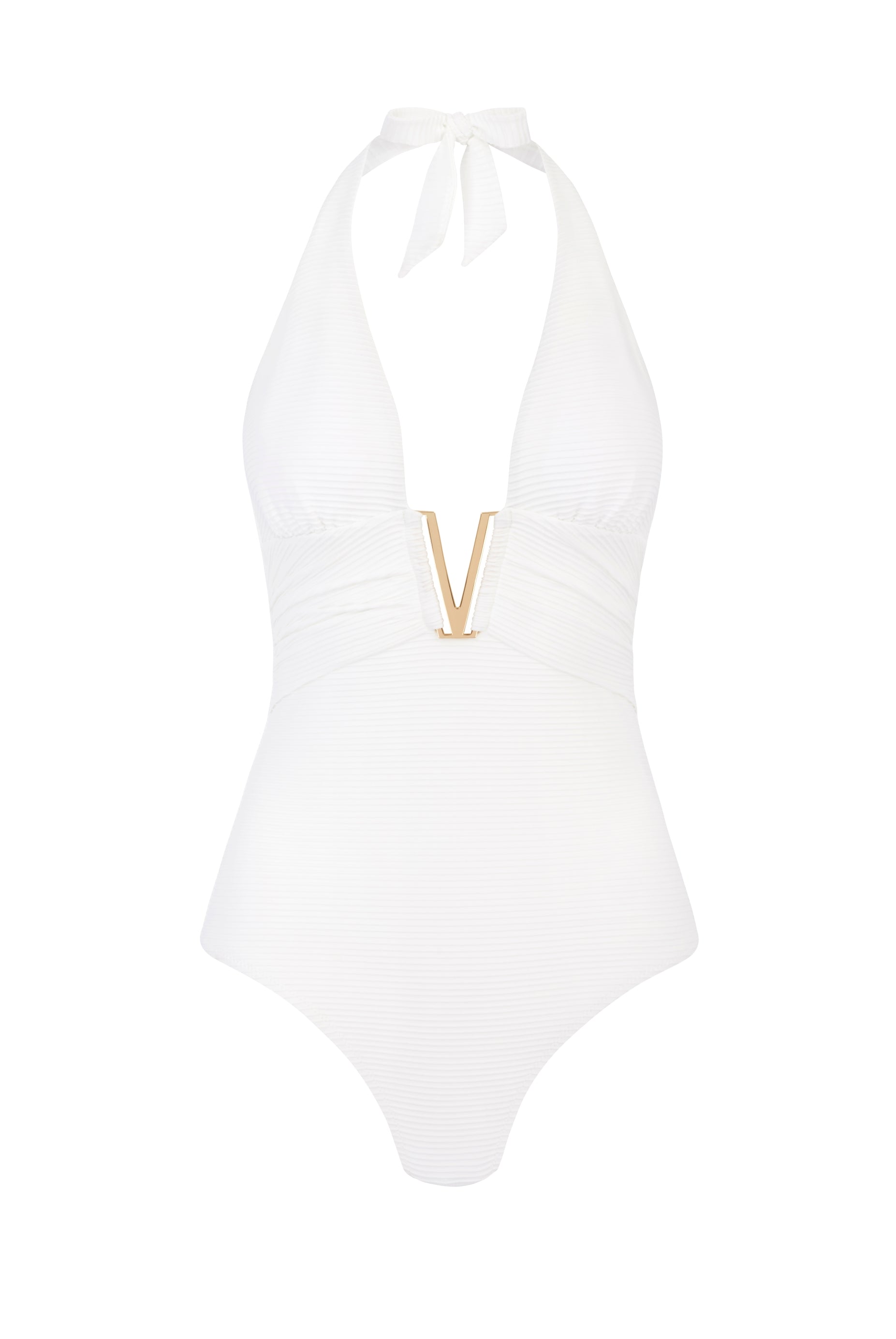 Our best-selling V-Bar halterneck swimsuit, in a classic white, blends support and style with a sculpting silhouette. Featuring our signature V-bar hardware and a decorative under-bust panel, this design provides a flattering shape and fit.