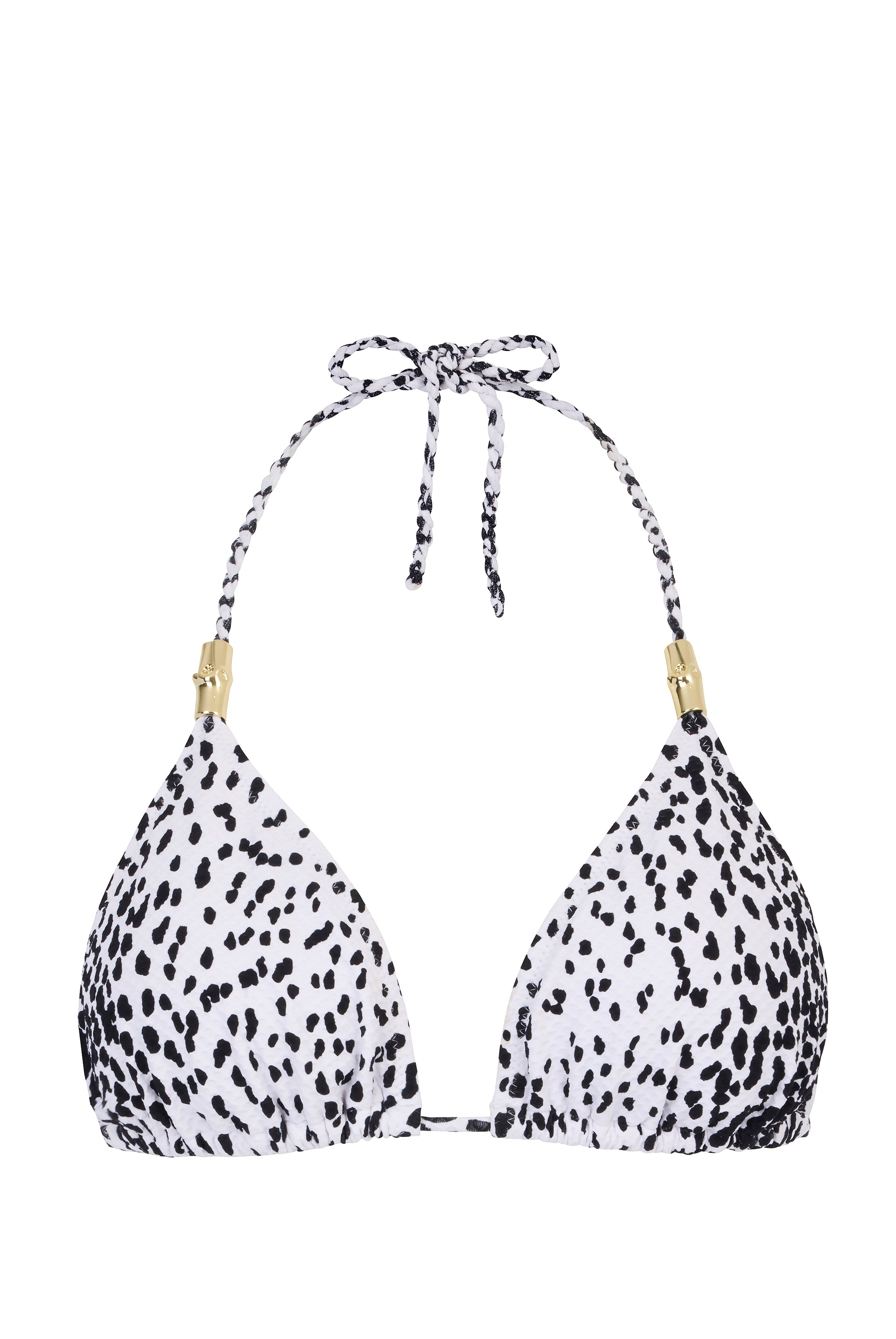 Our Icaria triangle top is our classic bikini shape offering the perfect amount of coverage and a little more support. This style features removable padding, adjustable rope necktie, embellished with bespoke gold bamboo hardware.