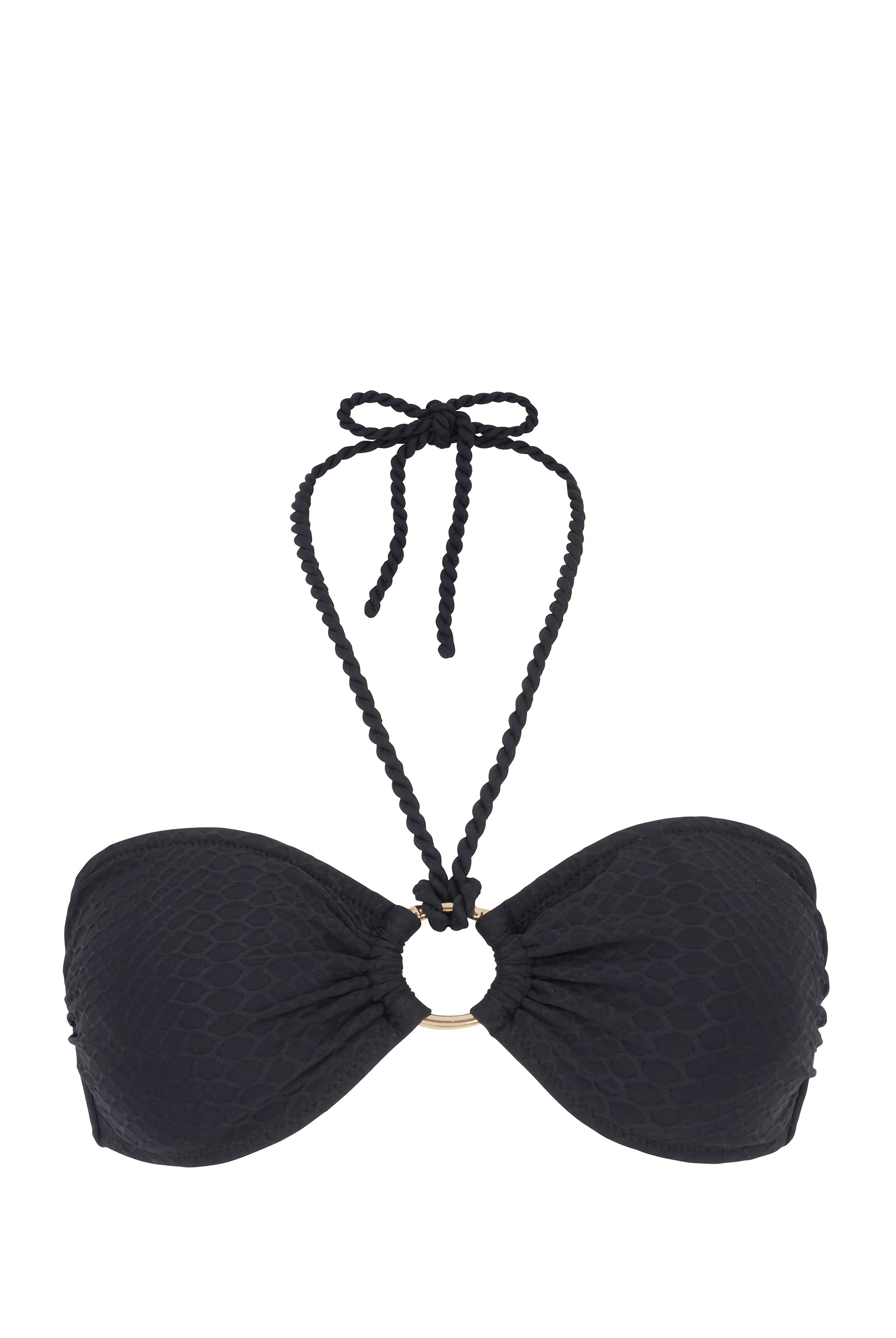 The Meteora ring bandeau top offers versatile styling, designed to be worn strapless or with a removeable rope halterneck tie, made in our signature snake jacquard with striking gold bamboo ring hardware.