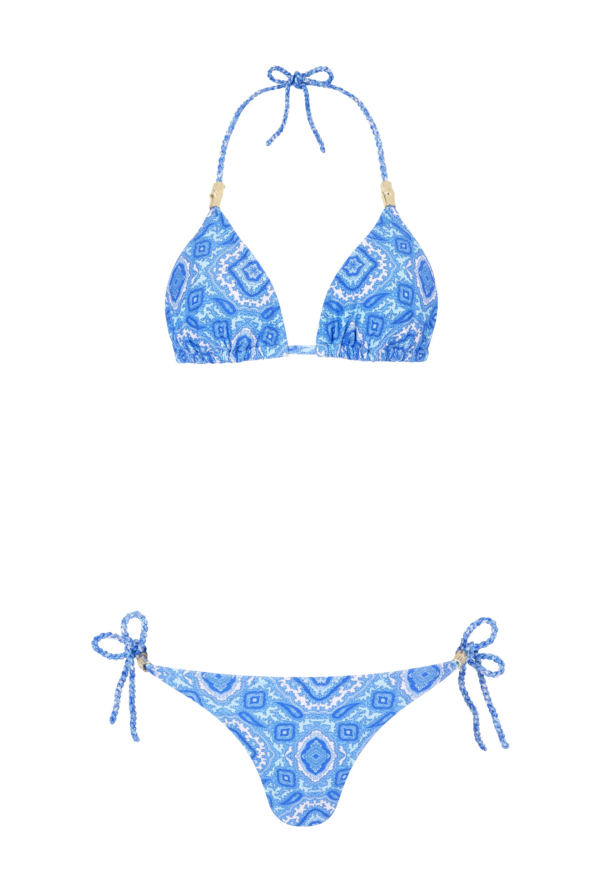 The Mykonos triangle bikini offers classic elegance with subtle support, featuring removable padding, adjustable rope ties, and gold ring hardware.