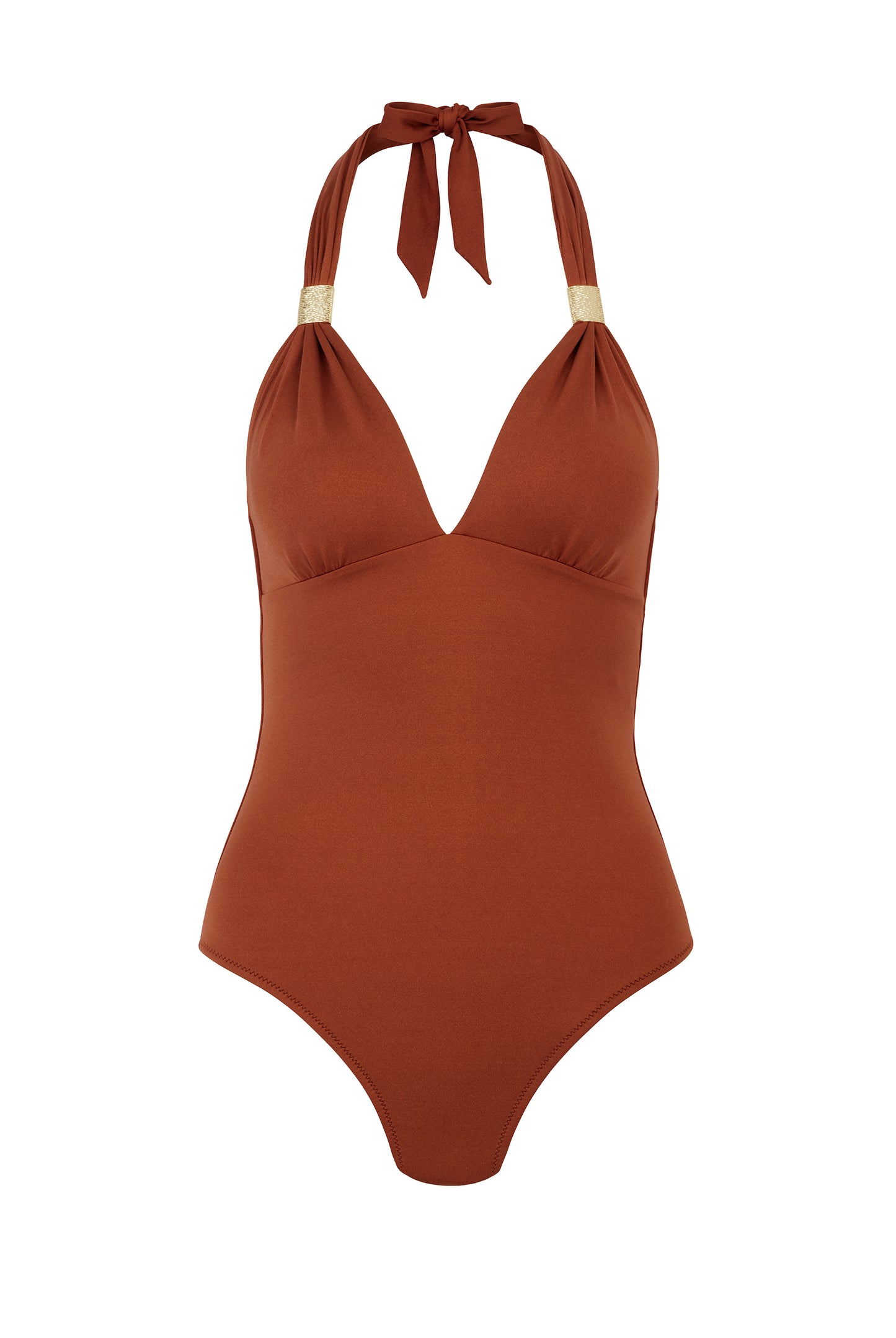 The Uzes slider halterneck swimsuit adorned with gold slider hardware can be moved up and down to provide different levels of coverage and create the perfect fit.