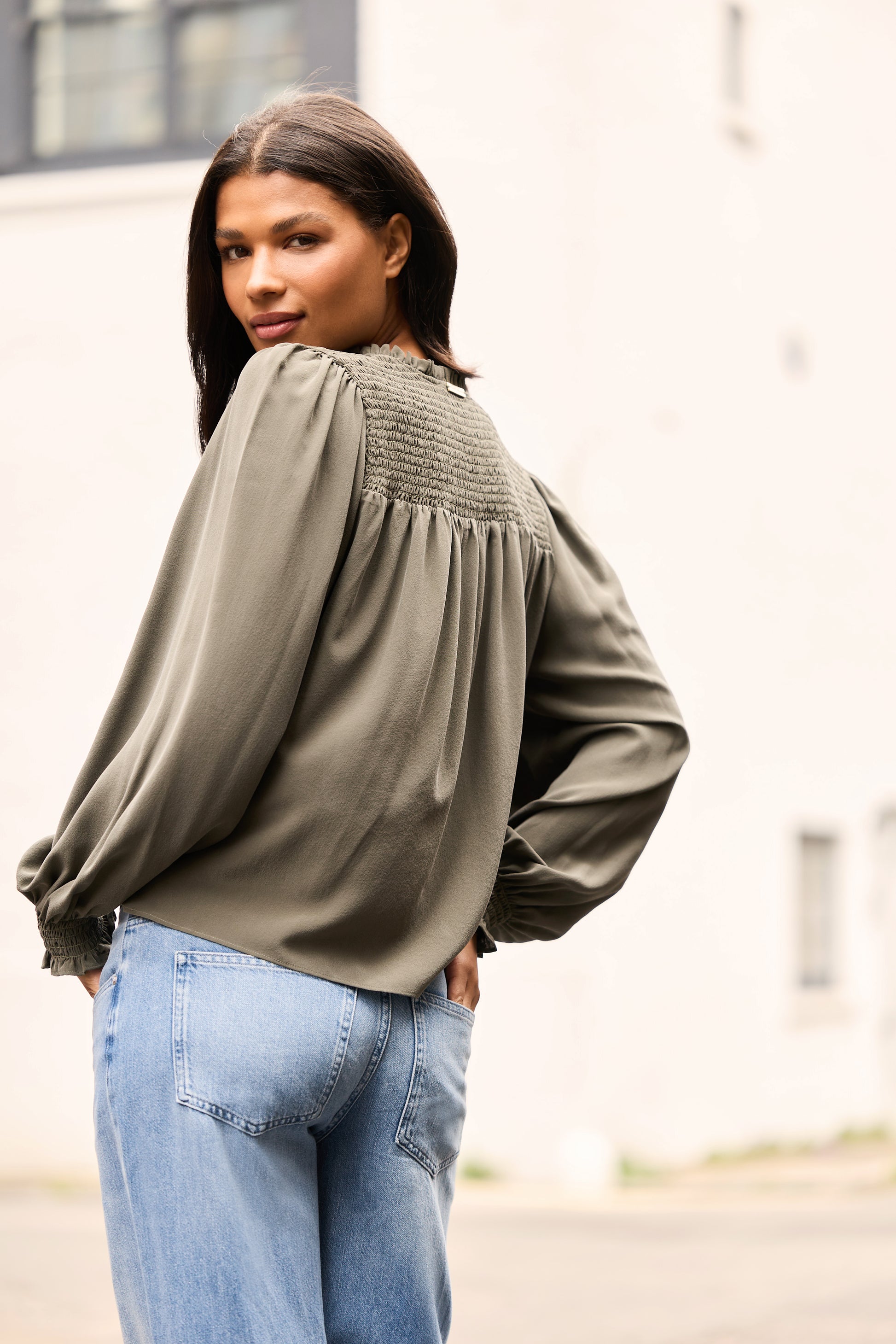 The Westbourne Silk Smocked Shirt offers a relaxed yet feminine look, featuring our signature frill neck, finished with gold hardware. This top makes the perfect transeasonal staple, perfect for dressing up with tailored trousers or down with jeans.
